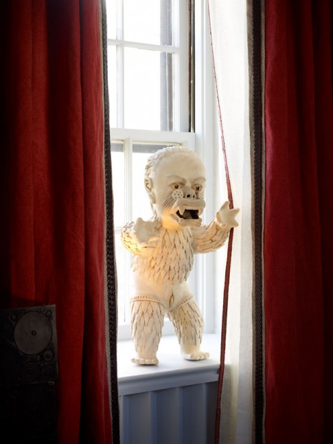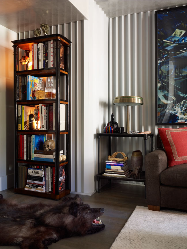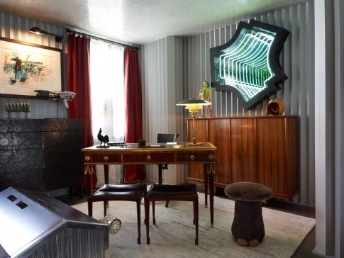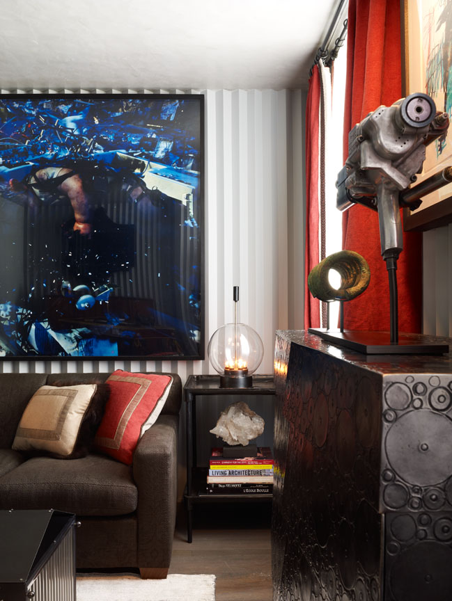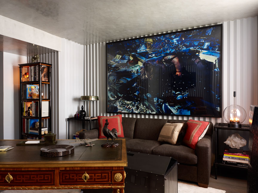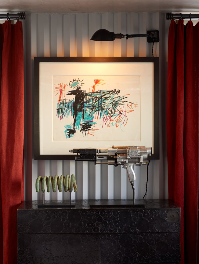 This edgy man-cave at the 2011 Kips Bay Showhouse instantly entrances its visitors with conversation pieces such as a museum-quality Louis XV! Desk by Rene Dubois and artwork by Cindy Sherman and Jean-Michel Basquiat.