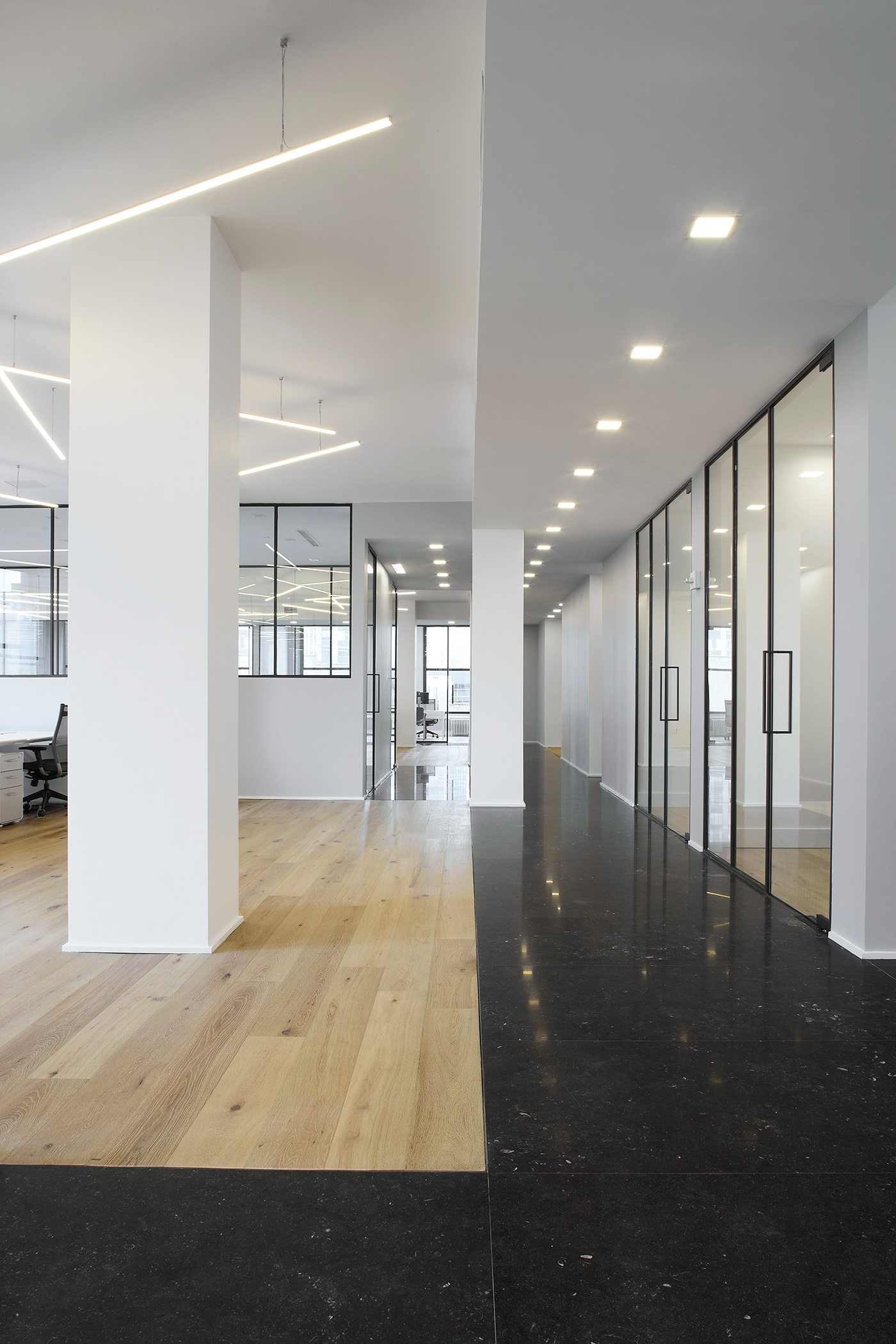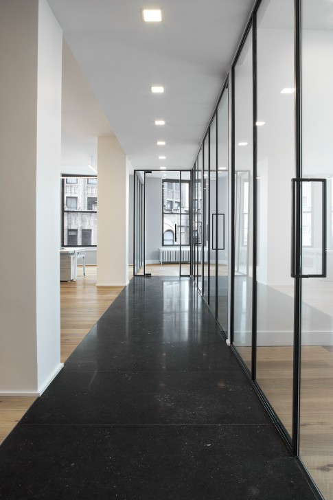 Inspired by a cloister, these headquarters for a New-York hedge fund features a central conference room that serves as the proverbial brain of the space. Energy flows from this center through a radial corridor that connects each of the offices, creating a design solution that is functional and elegant in its simplicity.